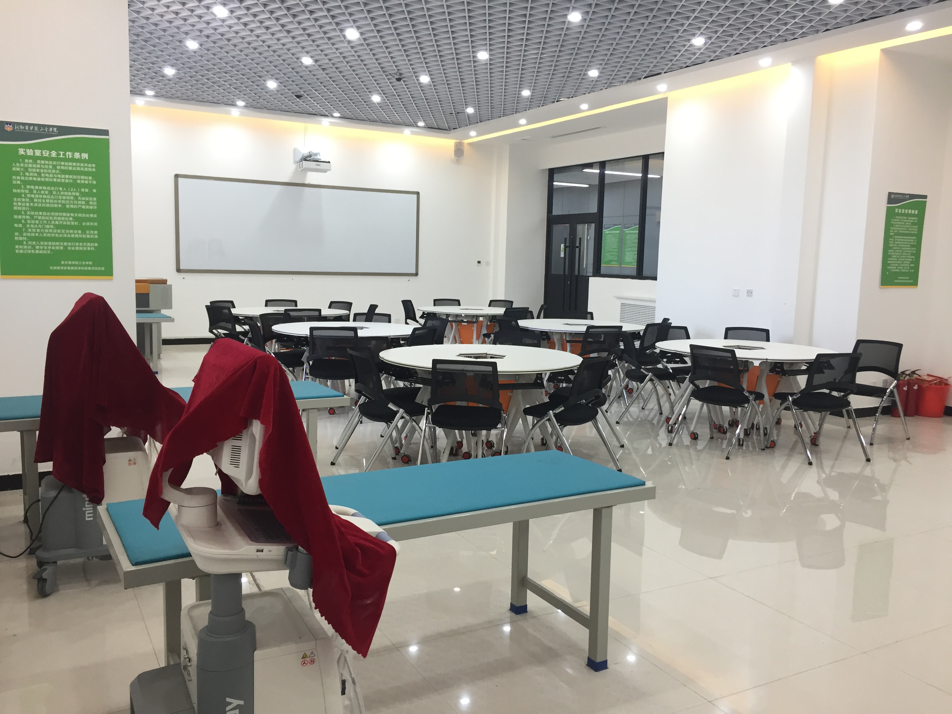 在建设的过程中,按照校领导理念领先,体现现代,注重技能,突出应用的指示,检验与影像学院会同教务部积极邀请附属医院的赵洪增、吕庆波、李合鹏等主任多次到校参与论证并到现场进行专业指导。该中心结合现代先进的教育教学理念和现代教育技术的发展规律,充分体现以学生为中心,以岗位能力为导向,采用智慧教室模式进行教学,突出个性化、体验式、合作式学习以及互动式教学;同时,学校也高度重视环境保护及辐射安全防护,所有的墙面都涂有硫酸钡防护,铅窗和铅门都采用4mm铅当量的防护,达到并超过国家安全标准。在实验室管理上,采取“责任田”制度,责任到人,检查到位,充分保障了实验室的安全规范运行。
