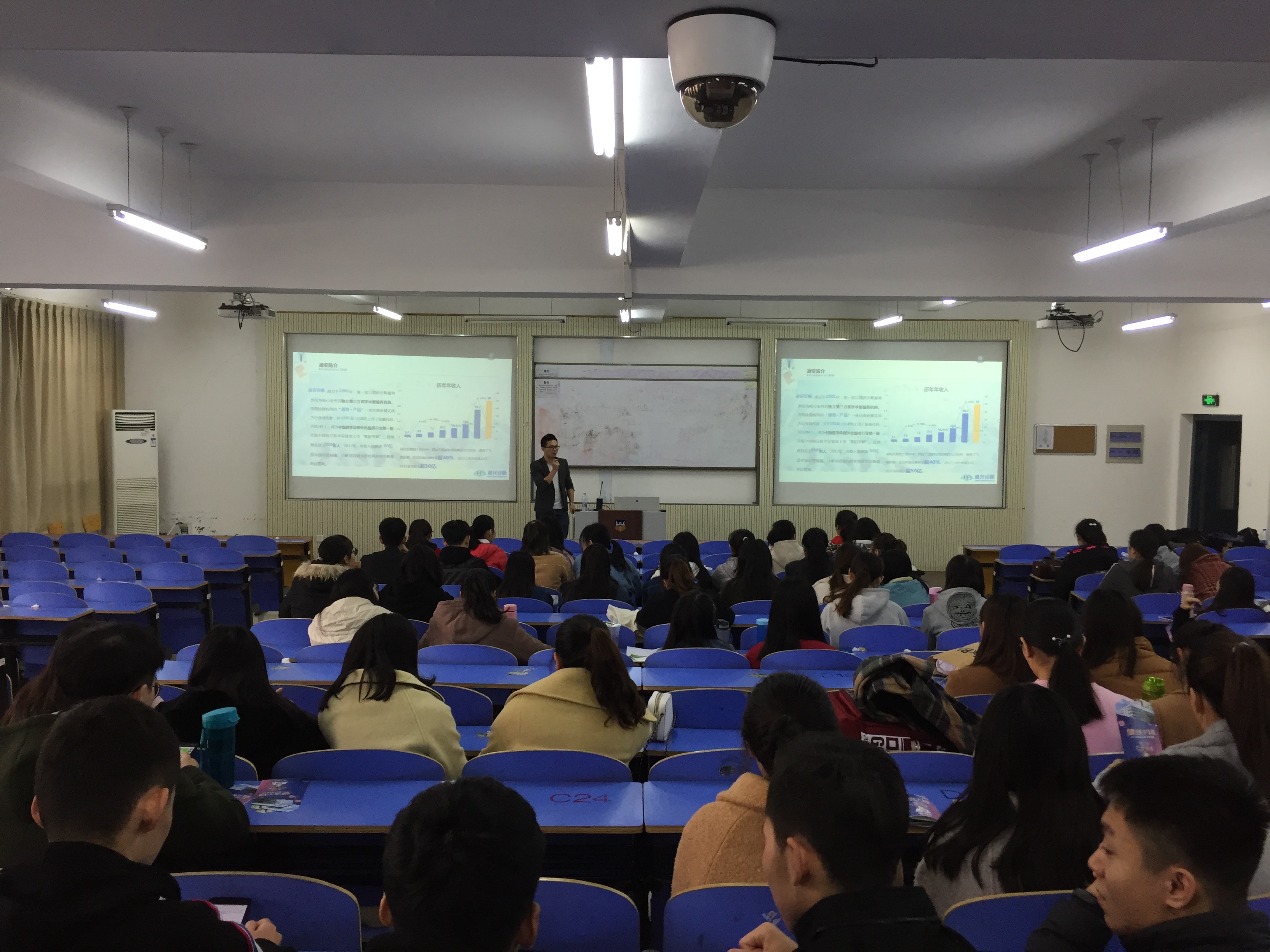 随后,在平原校区瑾学楼B202教室,胡坚为医学检验技术近百名师生做了报告。为大家介绍了迪安诊断公司的成就、现有规模及前景展望,就实习中实习生的管理方式、轮岗制度、薪酬待遇、食宿条件做了详细介绍,希望我院学生能够到公司实习并欢迎我院毕业生加入。