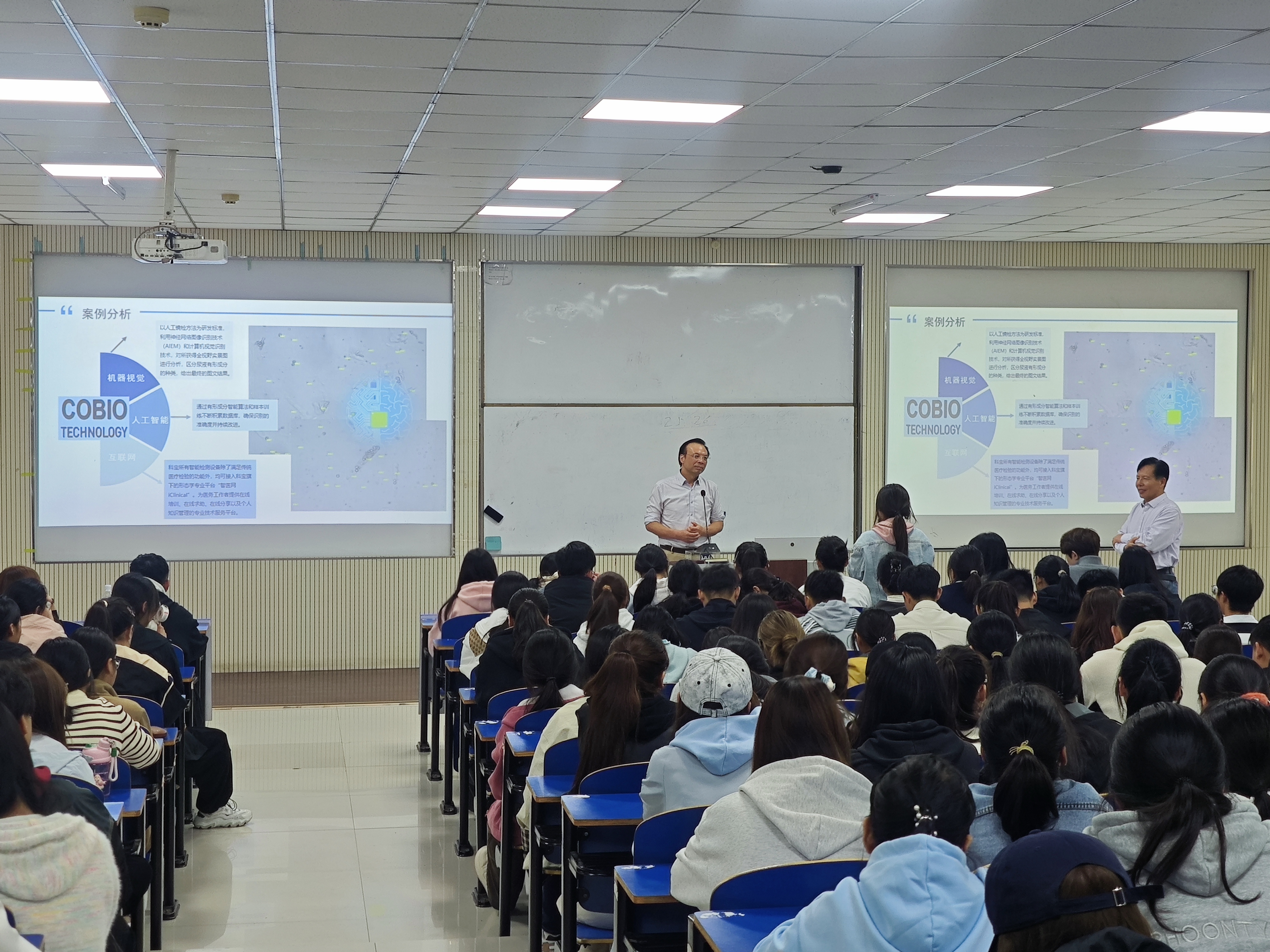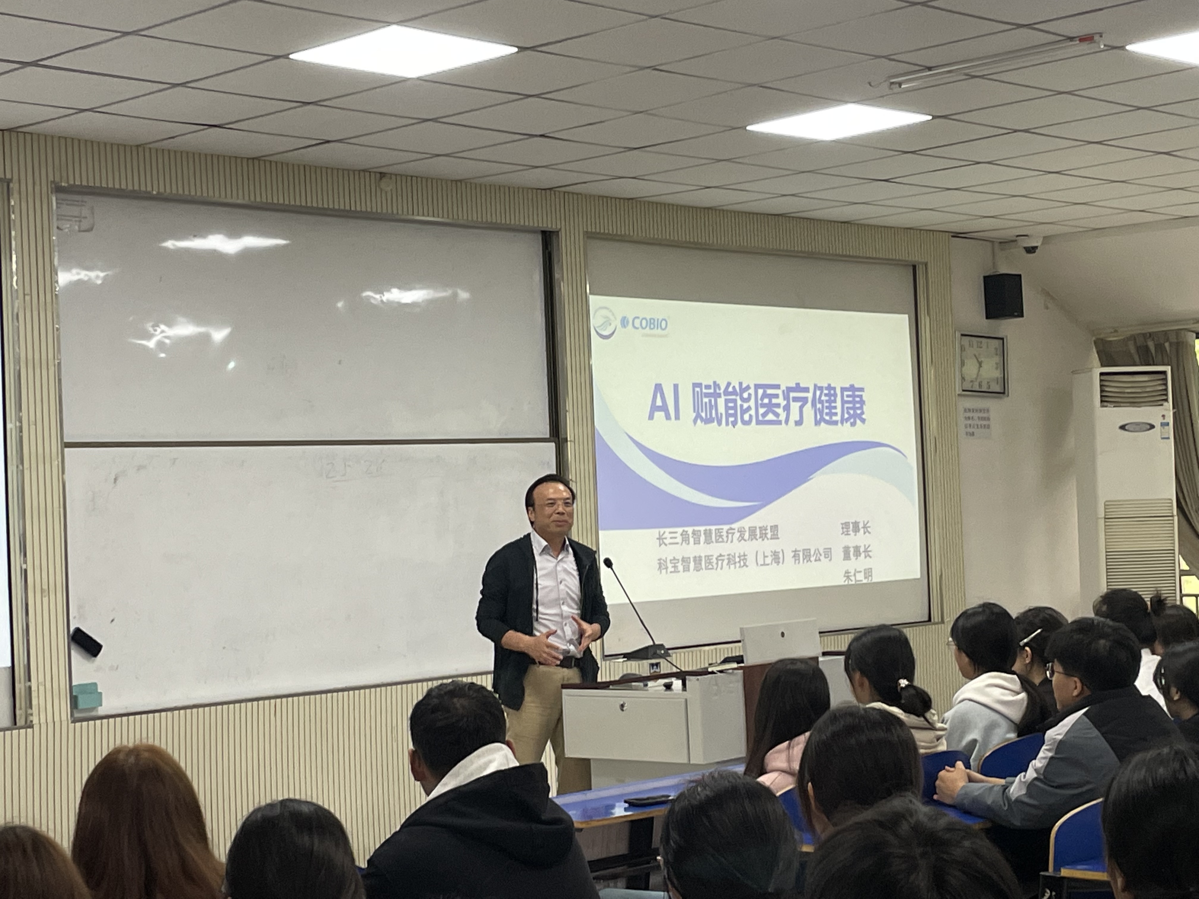 座谈会结束后,随即前往谨学楼A302教室。为学生和教师带来了一场主题为“AI赋能健康产业的进展”的精彩讲座。讲座中,朱仁明董事长凭借亲切的态度、饱满的激情与强大的感染力,以 “AI 赋能医疗健康” 为核心,先明确 AI 与人类的关系 ——AI 是工具而非替代,是人类意识的延伸。他介绍 AI 由算法、算力、数据、可信四要素构成,在医疗领域可实现流程自动化、认知洞察等应用。结合数据,他提到 AI 能推动医疗产品新功能开发、优化运营,还以科宝智慧医疗的尿液检测为例,说明 AI 通过神经网络图像识别技术提升检验准确度,其 “智医网” 平台还能为医务工作者提供专业服务,让师生直观感受 AI 在医疗检验中的实践价值。学生们聚精会神地聆听,这些在书本中难以学到的行业知识,让他们大开眼界,对自己所学的医学检验专业有了更为全面、深刻的认识,也促使部分学生明确了未来的学习目标和职业发展方向。